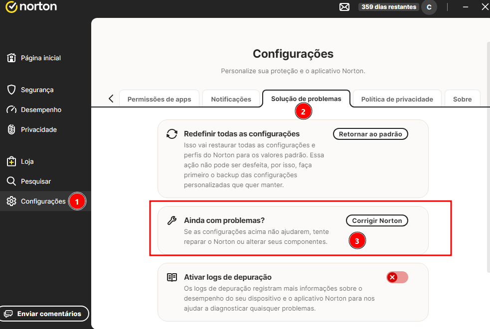 Try going to the settings as shown in the image below >>>> troubleshooting >>>> fix Norton