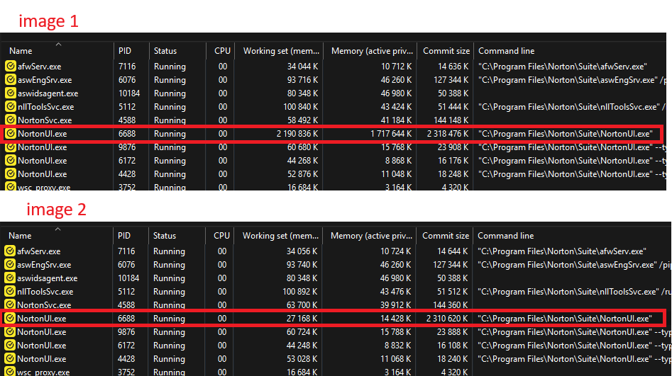 but if i open Norton window, and just press “X” (close), automatically “working set” drop in normal usage, but commit size still 2.3GB (image 2)