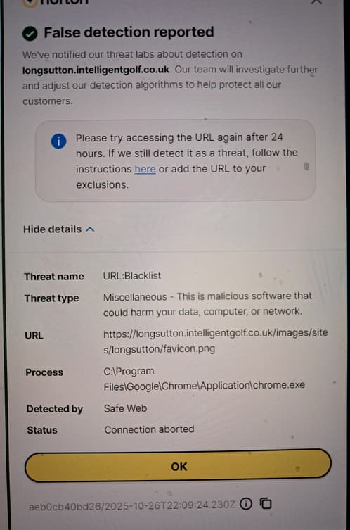 Please contact Norton support and advise support that you’ve submitted dispute and waited 48 business hours. My understanding is…once you state that you have already submitted False Positive over the submission portal and waited 48 business hours…support agent shall take the URL and detection screenshot and advance the case.