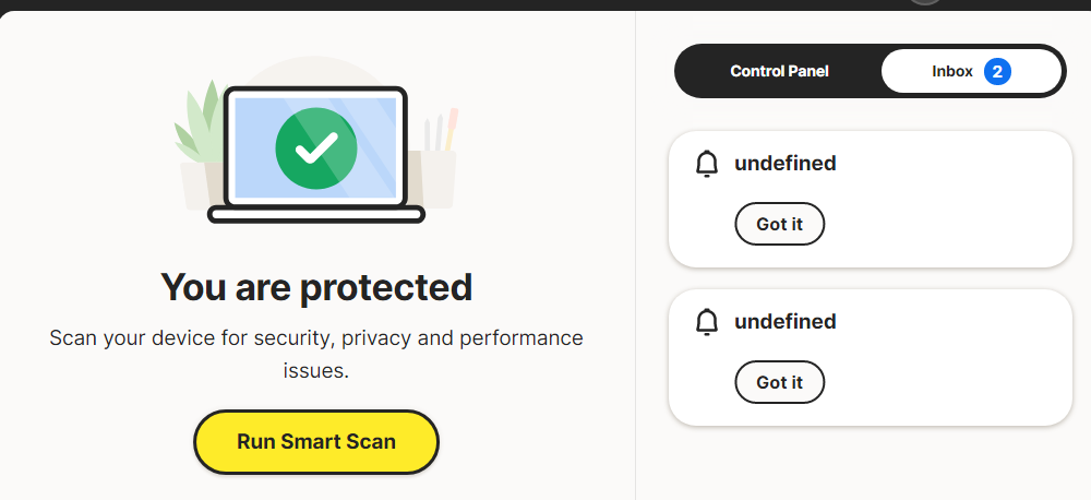 Thank you for your reply JJ. I just now ran a Smart Scan and then a Quick Scan after I saw your reply and this is what I am now seeing in my Inbox below which is what I replied about above. I did not see the "Undefined"problem we have been experiencing. I had been doing weekly maintenance on my computer and have restarted it before trying it and I also do not sign in to Norton through my app. They may still be working on it and rolling out a fix in increments. All I can say is try restarting or shutting down your computer then boot back up. Just check it at times. FYI my Norton 360 Deluxe is Version 24.11.9615 (build 24.11.9615.891).