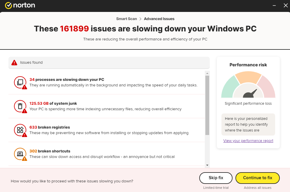 Performance “Risks”: Smart Scan often labels non-critical items (like temporary browser files) as “issues” to create a sense of urgency, prompting you to “View Solution,” which opens an advertisement for a Norton cleanup tool.