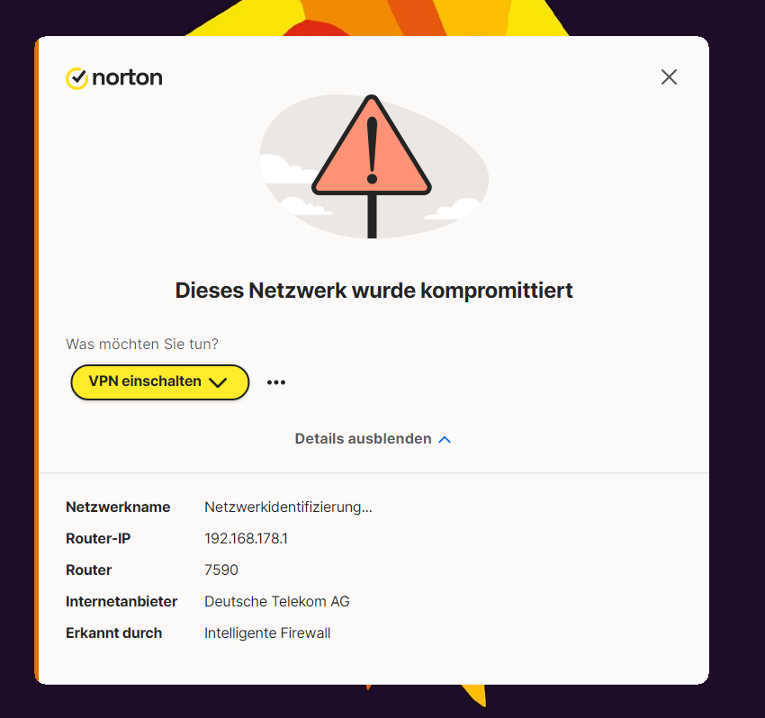 Jetzt habe ich aber ein Problem auf einem meiner PCs: Gelegentlich erhalte ich die Meldung “Dieses Netzwerk wurde kompromittiert”. Außerdem behauptet Norton, der PC wäre mit einem neuen Netzwerk verbunden und prüft dieses. Der Rechner ist aber immer über LAN mit derselben FritzBox 7590 verbunden. Bei meinen anderen Geräten (Laptops, Smartphones), die alle per WLAN verbunden sind, tritt dieses Problem nicht auf.