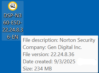 Based on the filename structure DSP-N360-ESD-22.24.8.36-EN.exe, DSP stands for “Direct Service Platform” and indicates a downloadable installer file for a Norton 360 security product.