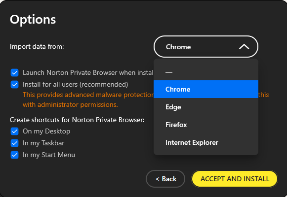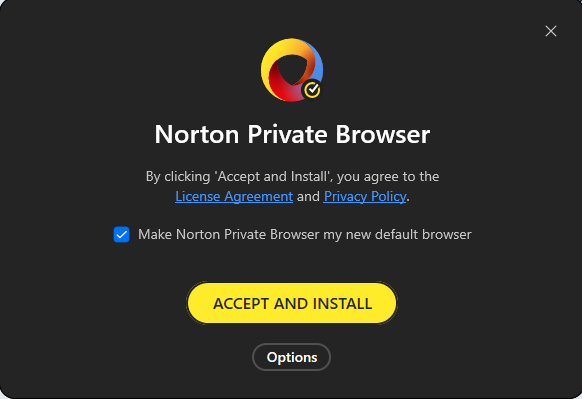 Norton Private Browser default install Options
