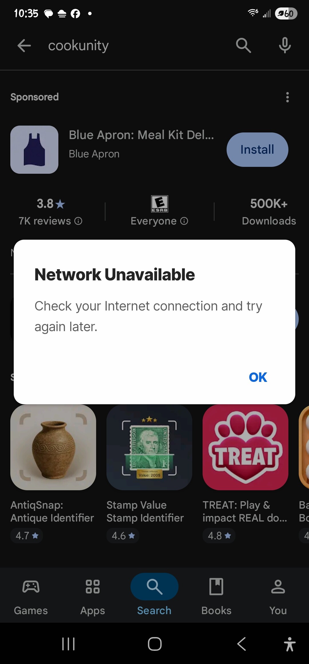 The network not available sounds like an issue with your home network. First suggestion is to restart your phone. If that does not help and you have cell data, try turning off wifi and use the cell connection to download the app.