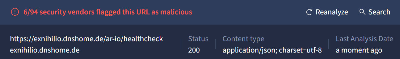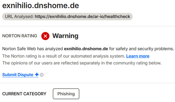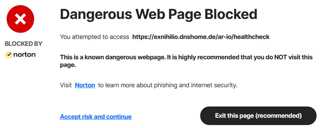 Nortonâs classification of https://exnihilio.dnshome.de/ar-io/healthcheck as URL:Blacklist means their security systems have identified the URL or the underlying domain as a known security risk, regardless of its intended purpose as an API health check endpoint.