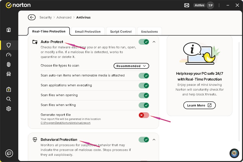 Note: Scroll down in Behavioral Protection to disable its report. Don’t disable that setting entirely.