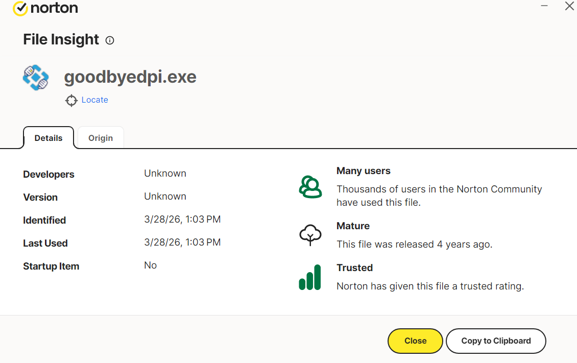 If you downloaded GoodbyeDPI from the official GitHub, it is widely considered safe by the privacy community. However, if you got it from any other source, Norton’s alert might be a true positive, as third-party mirrors often bundle this tool with actual malware.