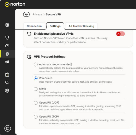 Norton Secure VPN feels better with WireGuard than when set to Automatic likely because WireGuard is engineered specifically for superior speed, simplicity, and low latency, which is ideal for general browsing and streaming.