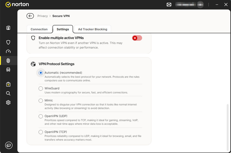 The setting persists: Once the menu is visible in the Norton 360 app settings, whatever you select there (Automatic, Mimic, OpenVPN, or IPSec) is the protocol the application will use to connect to Norton’s VPN servers.