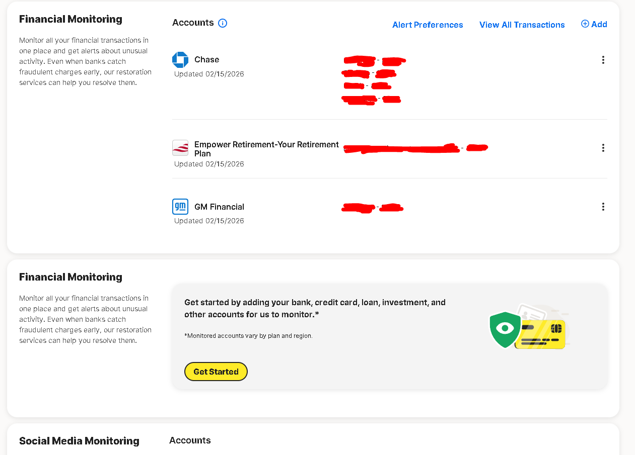 After logging into MY DOT NORTON DOT COM on the only Windows PC I ever use to do that I clicked MONITORED INFO on the navigation panel to the left and scrolled down to FINANCIAL MONITORING where I see the 3 accounts that Lifelock should be monitoring. I HAVE RECONNECTED all three institutions successfully on February 15, 2026 as shown in the first screen shot. It should be noted at this point that below my initial FINANCIAL MONITORING pane is another FINANCIAL MONITORING pane with a GET STARTED button which I’ve not seen before today. If I click VIEW ALL TRANSACTIONS from my initial FINANCIAL MONITORING pane I get a screen with a GET STARTED WITH YOUR TRANSACTIONS TODAY title and a GET STARTED button as if I have never submitted any accounts to be monitored. I then go over to the navigation panel on the left and click FINANCIAL MONITORING and once again get a screen with a GET STARTED WITH YOUR TRANSACTIONS TODAY title and a GET STARTED button as if I have never submitted any accounts to be monitored. If I use the navigation panel to the left and click DASHBOARD my FINANICAL MONITORING pane contains nothing more than the image of a monitor with a credit card symbol inside it and GET STARTED link.