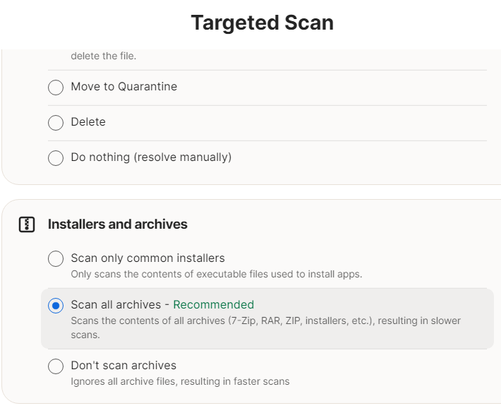 .zip files) to detect hidden malware.By using an on-demand scan, you can ensure that even files packed within archives are thoroughly checked for potential security risks before you decide to extract or run them.