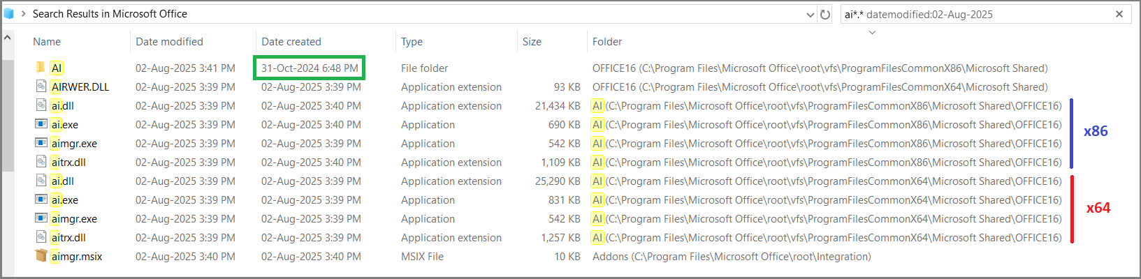 I use MS Office 2019 C2R (out of support as of 14-Oct-2025). A search of my C:\Program Files\Microsoft Office\ folder for ai*.* suggests most of my AI files were originally created in both
