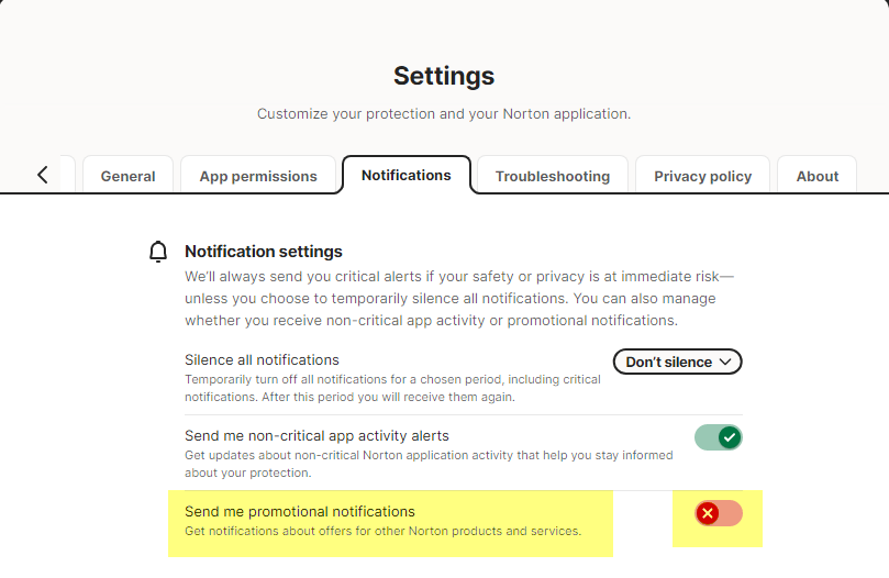 Mute special offers Turn off notifications about offers for other Norton products and services.