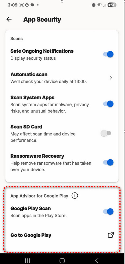 Account → Settings → Security → App Security for Google Play → Google Play Scan