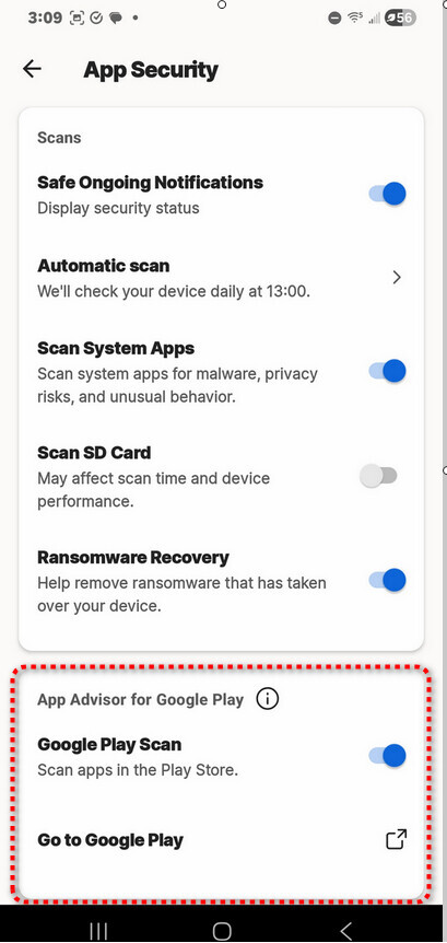 Menu → App Security → App Security for Google Play → Google Play Scan