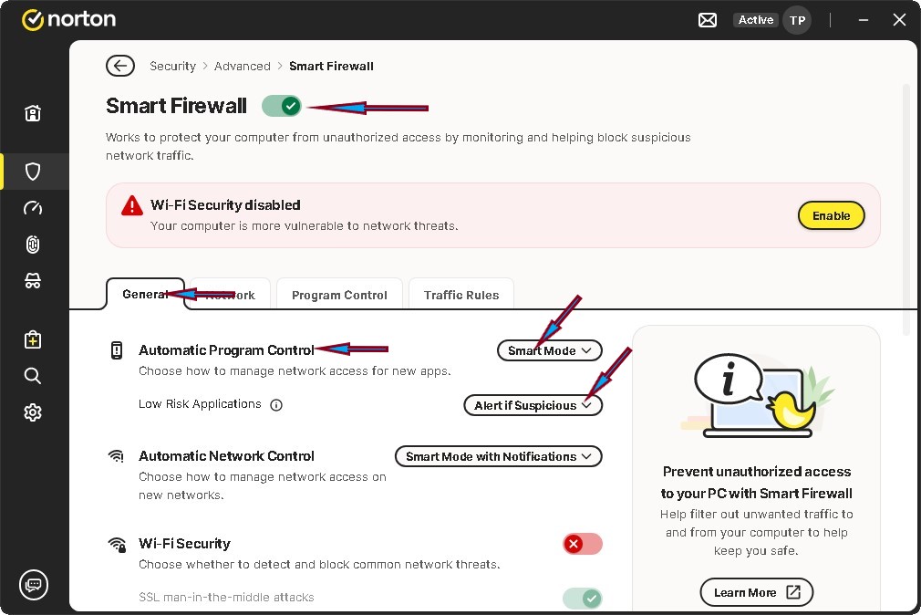 I keep getting errors that my internet access is blocked and that firewall or antivirus may have blocked the connection. I’ve attached a screenshot of the error I get. I’ve got Norton 360, version 25.8.10387 (build 25.8.10387.948). I’ve tried resetting my smart firewall settings and rebooting the computer, but the problem persists. It’s sporadic but happens frequently. The only thing that seems to work temporarily is to toggle the setting for the firewall under “additional settings” for “allow internet connection sharing” from “block” to “allow”. Apparently, the default setting is to block this access. When I do this toggling, can access the internet, but it only lasts a few minutes, and then it blocks internet access again. At this point, I toggle this setting back from “allow” to “block”, and again, for a short time, I can access the web. I’ve also attached a screenshot of the setting I’ve been toggling back and forth to get temporary internet access. This problem stared for me about week ago. Any help would be appreciated in fixing it. Thanks.