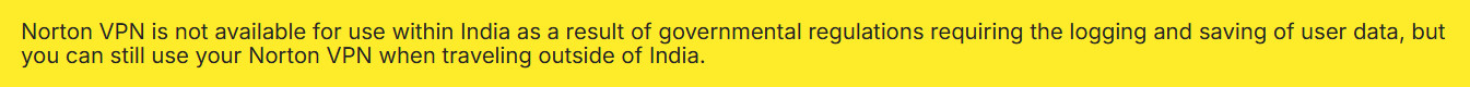 Norton VPN is no longer available for use within India as a result of governmental regulations requiring the logging and saving of user data, but you can still use your product/subscription when traveling outside of India.