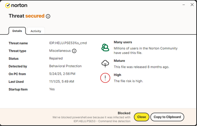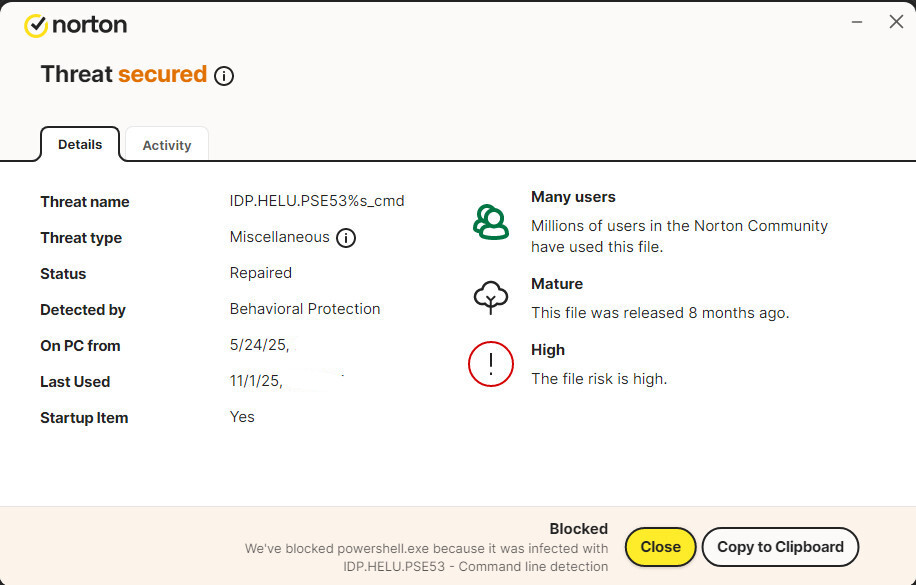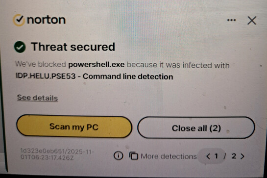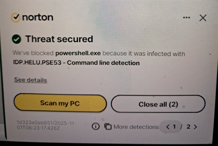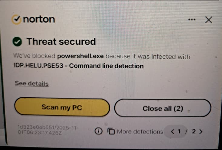 If Norton flags powershell.exe with IDP.Generic/IDP.HELU.PSS53, it is most likely a false positive, especially after a recent Windows update. This happens because PowerShell is a legitimate system tool that malware can sometimes exploit, causing Norton’s heuristic (behavioral) detection to get a false alarm.