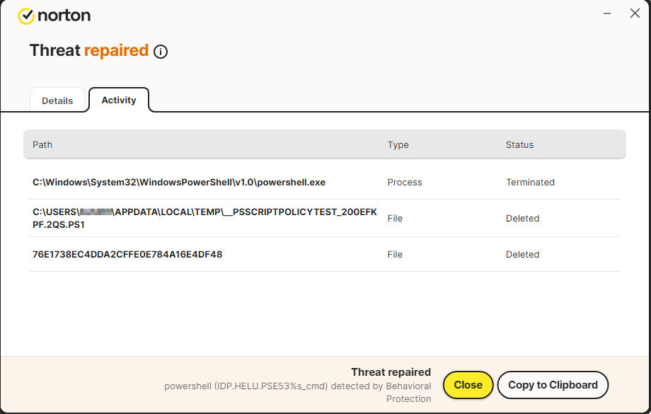 IDP.HELU.PSS53: This is a specific code used by Norton’s heuristic engine. The letters “HELU” and “PSS” likely refer to the type of suspicious behavior that was detected—in this case, related to the PowerShell script (PSS).