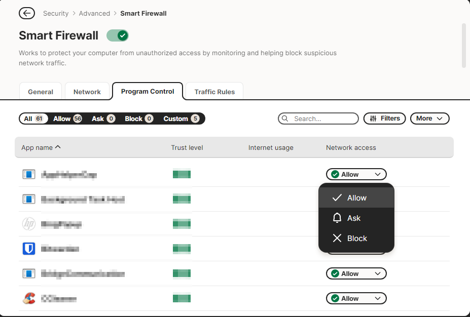 Open Norton 360: Double-click the Norton icon in your system tray or search for it in your Start Menu. Go to Settings: Click the gear icon in the top-right corner to open the settings. Find Firewall: Navigate to the “Firewall” settings. Open Program Rules: Go to the “Program Rules” tab. This is where you can see which applications Norton is controlling. Add the Pandafan executable: