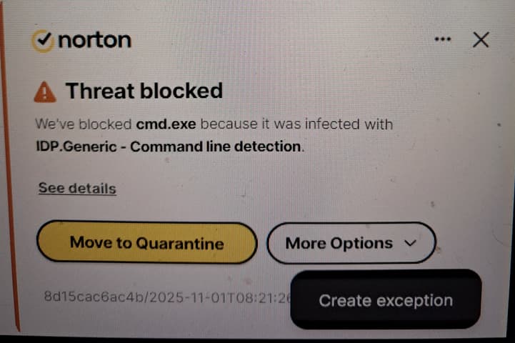 Norton 360 reports the threat name IDP.Generic%s_cmd because its Identity Protection (IDP) component has detected suspicious, non-specific behavior involving a command-line interpreter (likely cmd.exe or powershell.exe). This is a generic, heuristic detection rather than a specific known virus signature.