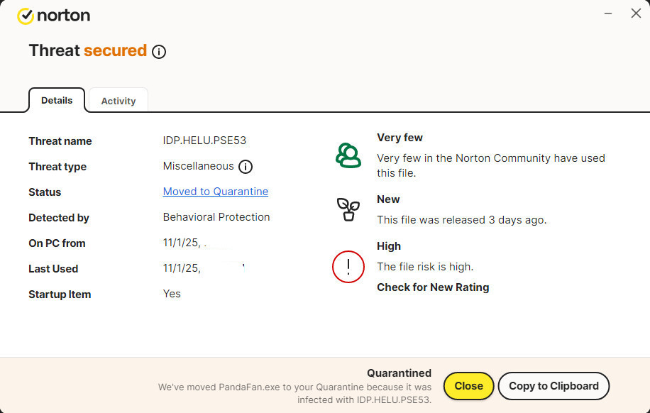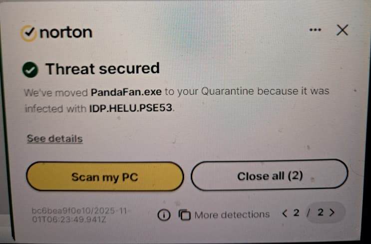 Malicious activity: The Norton detection code IDP.HELU.PSS53 specifically indicates a potential script-based malware threat. Although it may be a false alarm, there is a risk that the Pandafan update contains malware that is attempting to run PowerShell scripts with malicious intent.