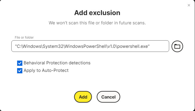 Do Not Globally Exclude PowerShell: Avoid excluding the main powershell.exe process entirely, as this leaves you vulnerable to actual threats. Only use specific, targeted exclusions if necessary and after verification.