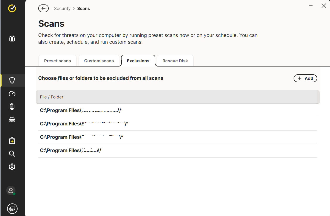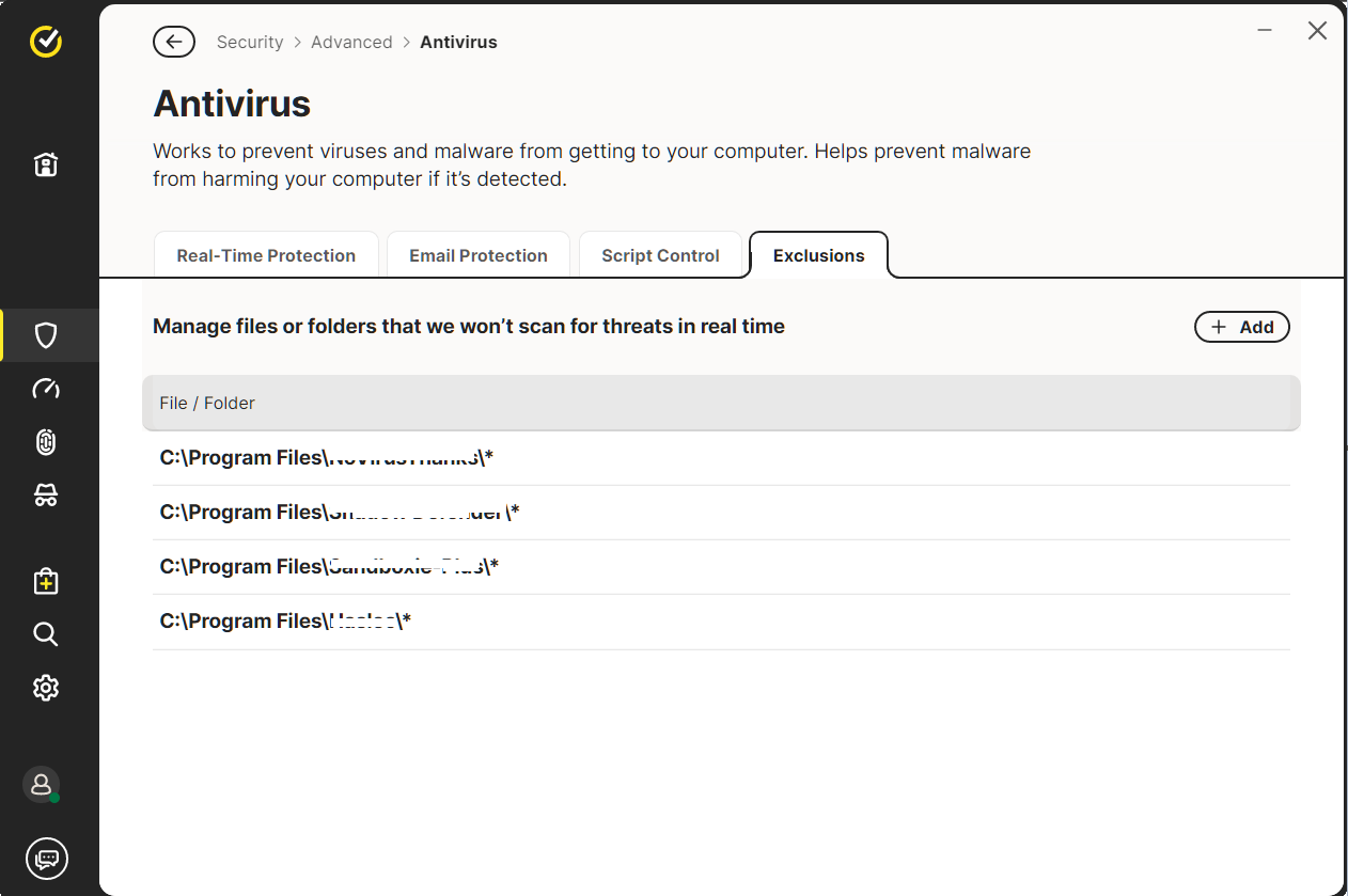 If you still have issues, you may also need to go to Settings > Antivirus > Scans and Risks and add the file path to the “Items to Exclude from Scans” list.