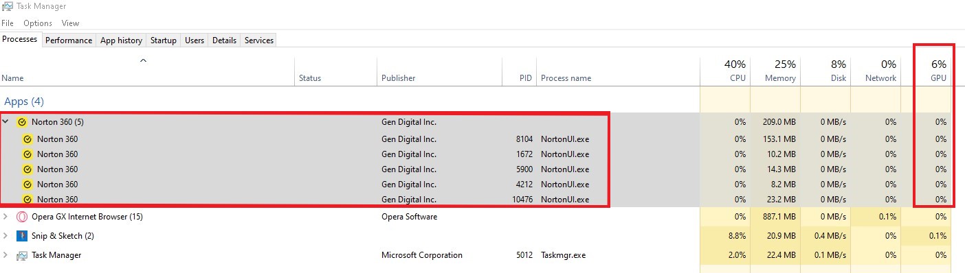 @PIRABAKARAPANDIYAN_P Could you please provide a screenshot of what is shown in Task Manager when you open the Norton UI? Below is what I see my side: