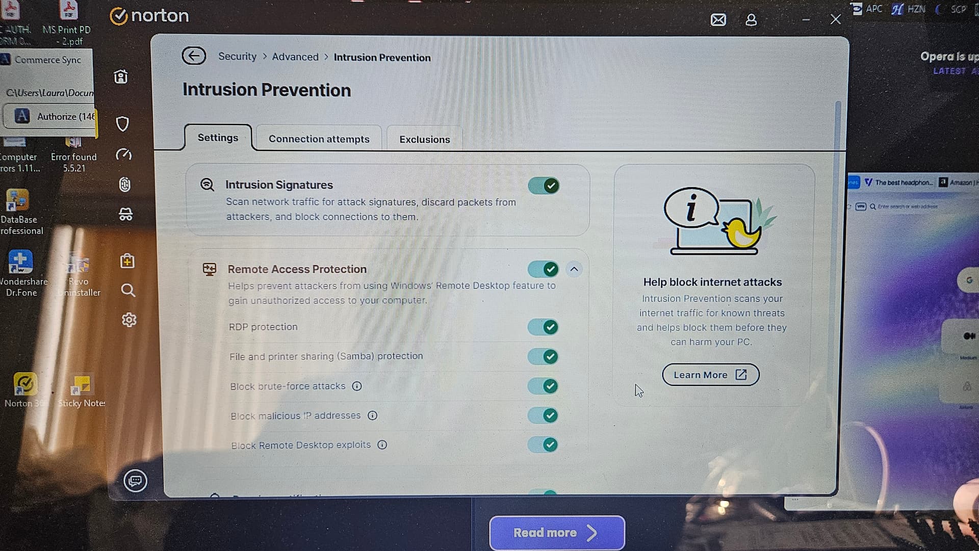 Norton security alerts are displayed in a protected Windows session