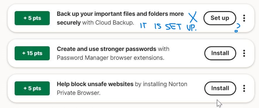 I noticed that when I open that Protection score up it still shows that bogus message ab setting up backup which i have already done. Thought that was fixed. Nope