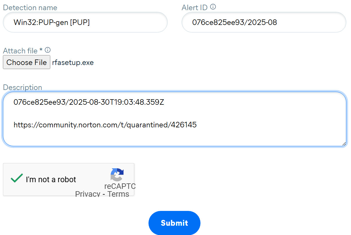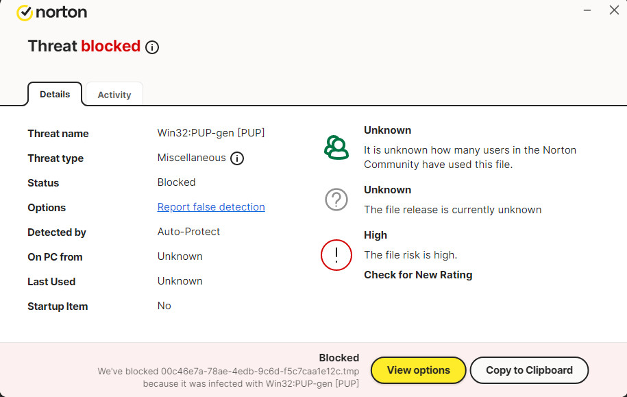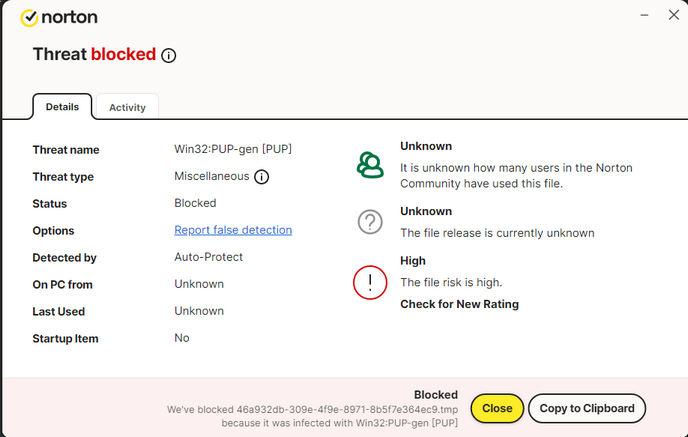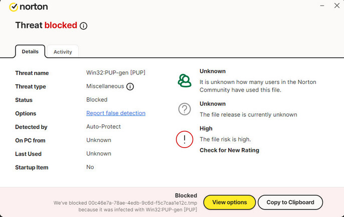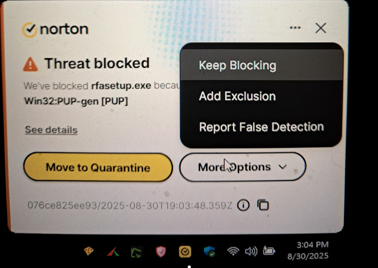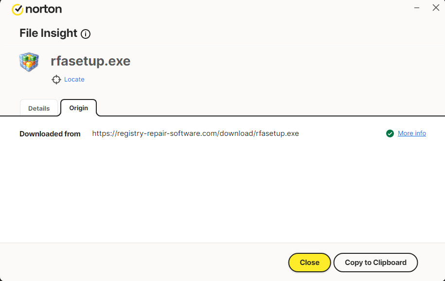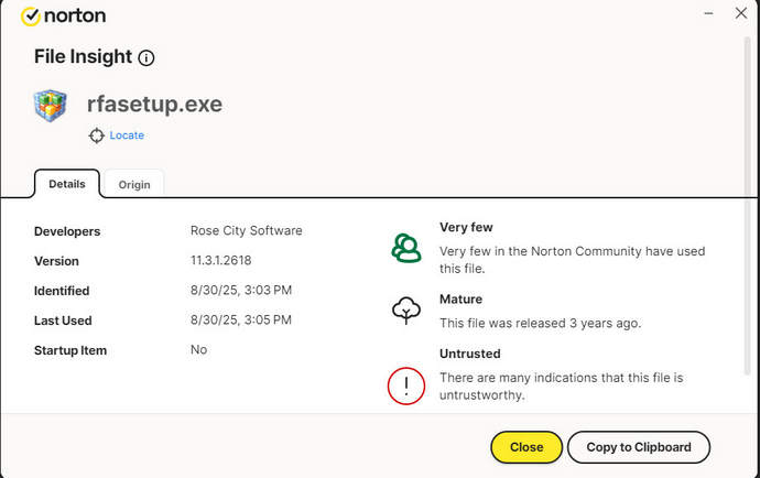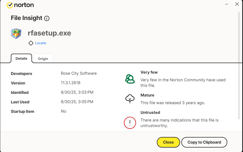 Norton File Insight reports rfasetup.exe as “Untrusted”