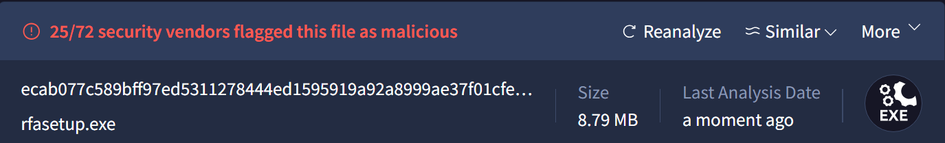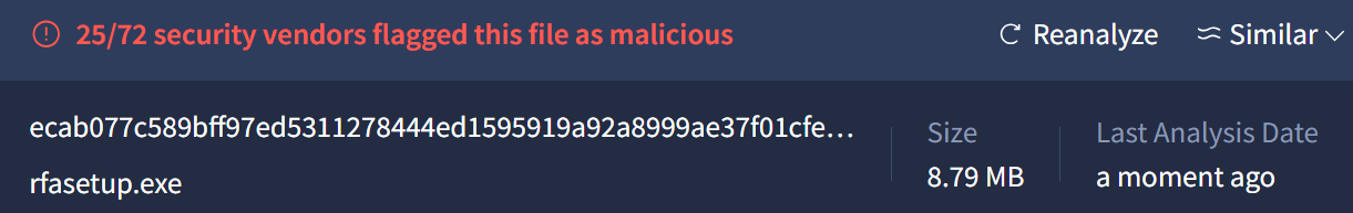 rfasetup.exe as “Win32:PUP-gen [PUP]”Malwarebytes on-demand scan reports rfasetup.exe as PUP.Optional