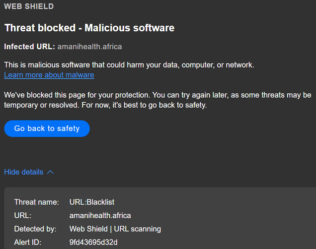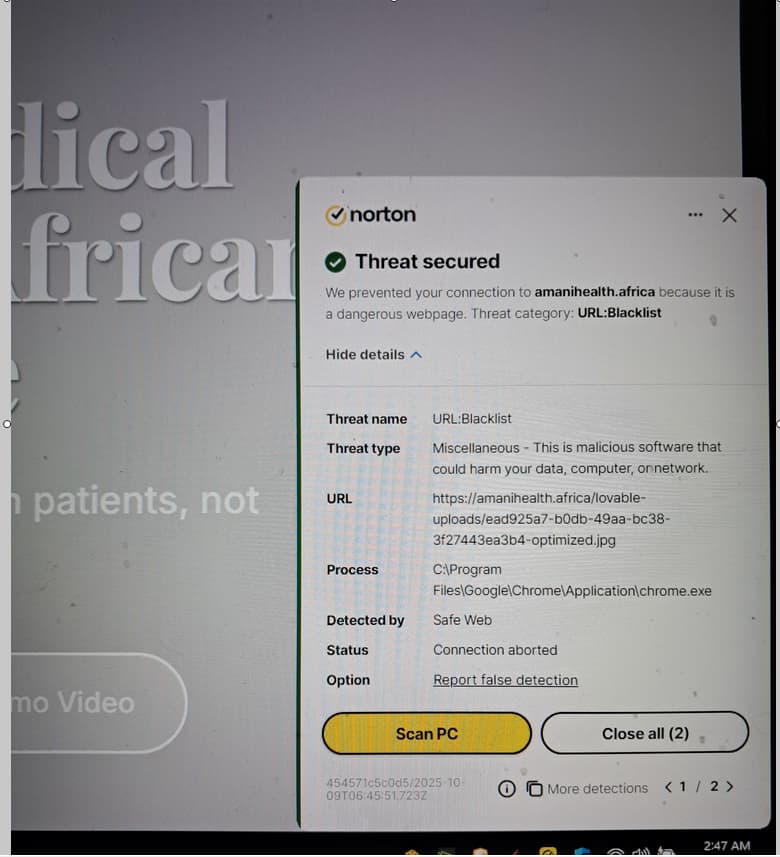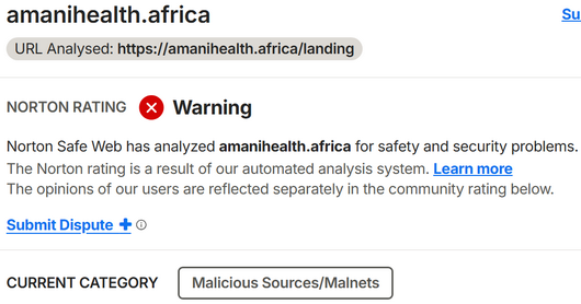 My legitimate business website (amanihealth.africa) has been incorrectly flagged as ‘Phishing’. Norton’s automated dispute system is ineffective in reviewing my site and has me locked in a loop with conflicting information for over a week. I need this escalated to a human for manual review immediately.