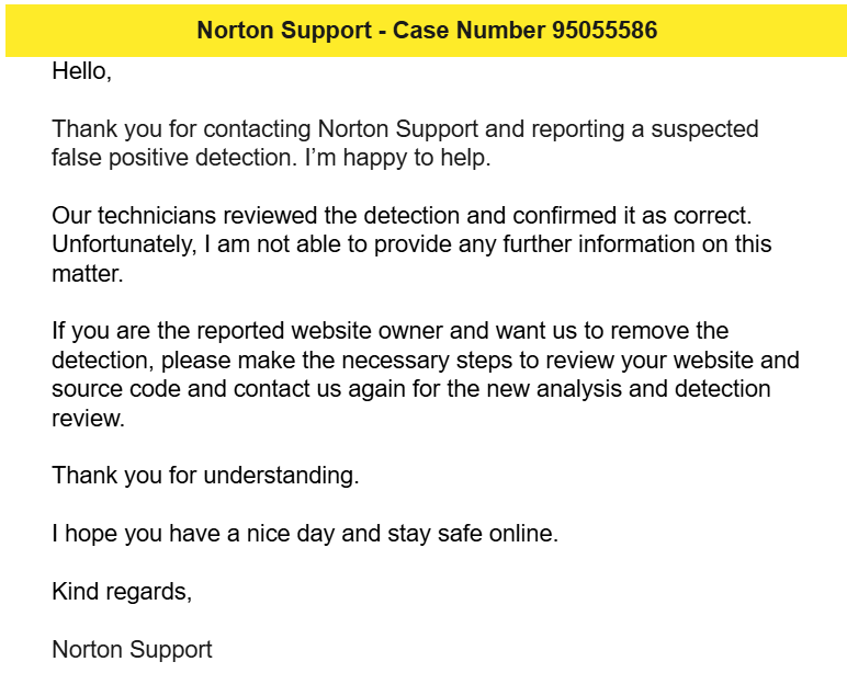 Well, I reached out to Norton Chat support…and uploaded pics …and advised Chat that it’s been over a week…and requested FP be referred to Safe Web team…and Chat wrote…and then Chat agent ended session.