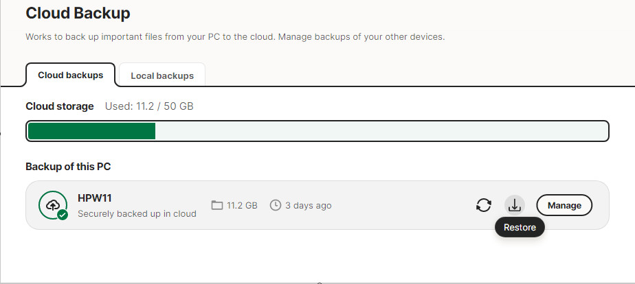 I had to change hard drive. Reinstalled Norton on new drive. In “Cloud Backup“ window it shows that there is “Cloud Storage Used 32/75 GB“. So it knows that cloud backup exists. But no options to choose any backup to restore. Only one buton “Back Up this PC“. How to restore files from cloud backup?