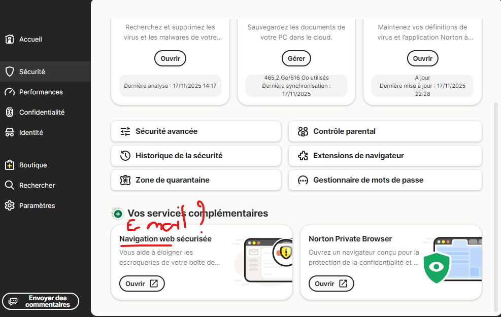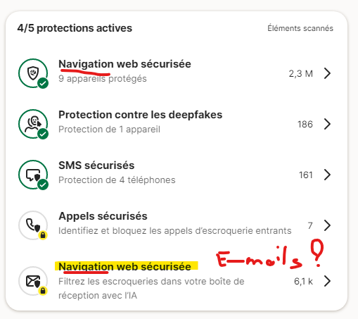 1- There is clearly confusion between “secure web browsing” and “secure emails” in the french Windows version of Norton 360.