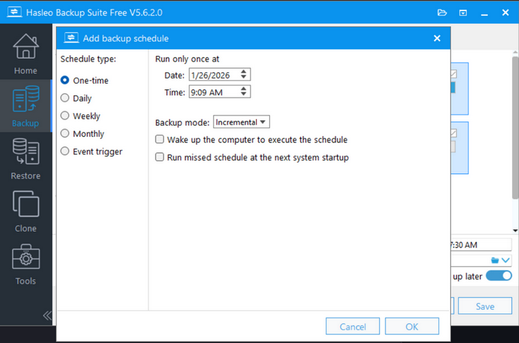 No Time Drop-down: The “When” tab no longer features a start-time selector for daily backups.