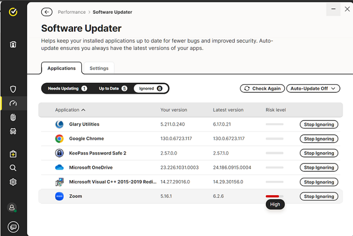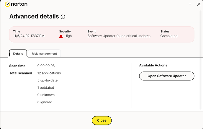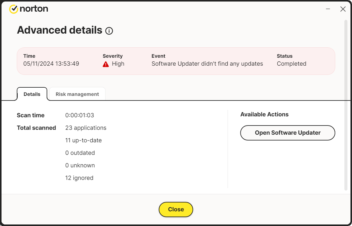 When checking Security History, why is Software Updater marked as High Severity when there are no updates found (ie required). Surely that should be regarded as good and given a Green Flag.