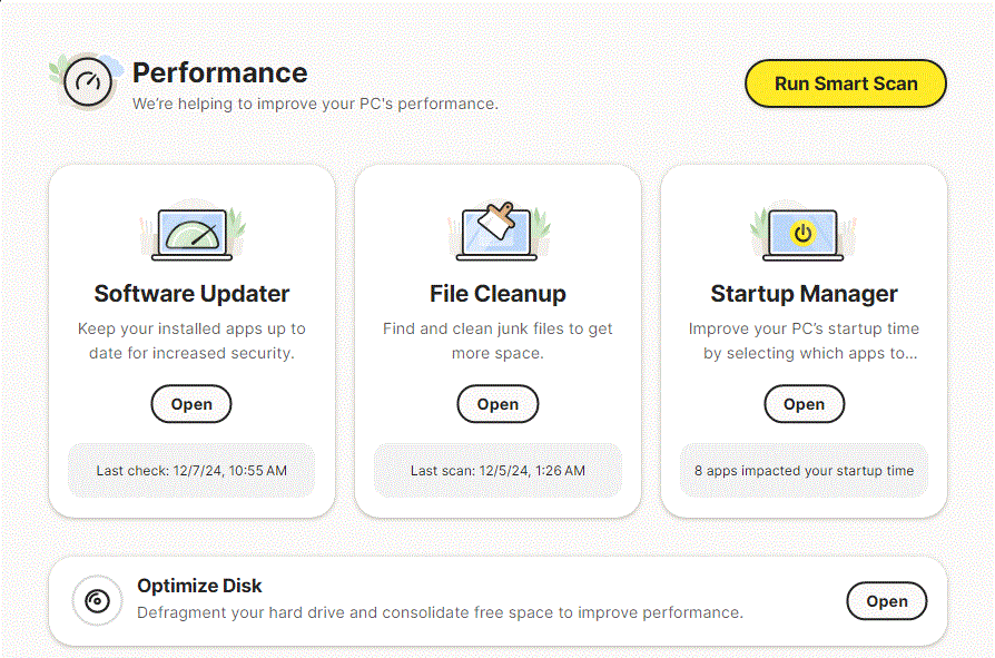 Is there anyone who knows how to remove the section circled in the picture, the one about performance scan? I ran a Smart Scan a while back and ever since, for weeks, this notification appears on my Norton screen and I can’t seem to get rid of it. It’s pretty annoying by now.