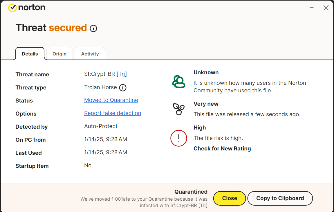 Je dois reconnaitre que Norton n’a pas failli lors de ce test très basique et sans réelle valeur. Il a réagi quasiment immédiatement.