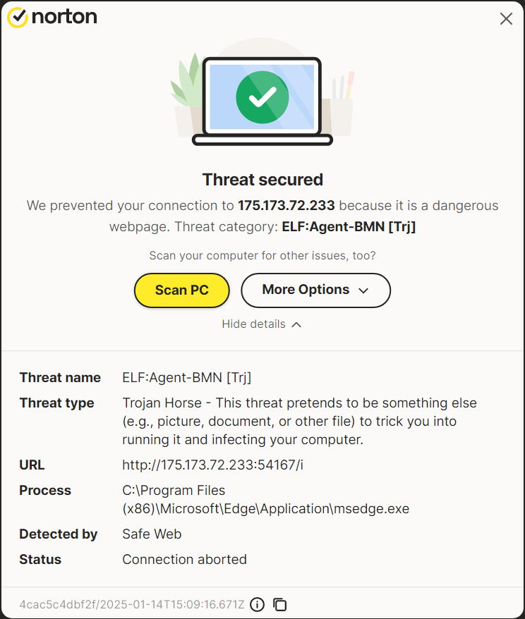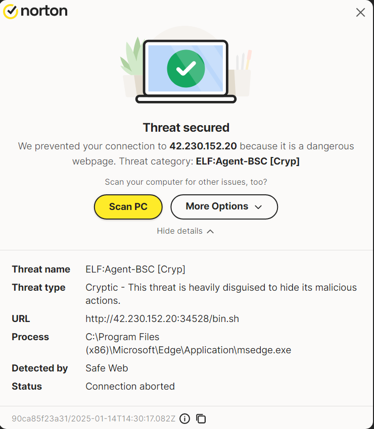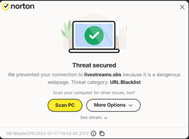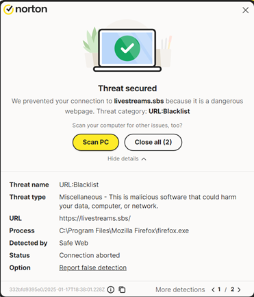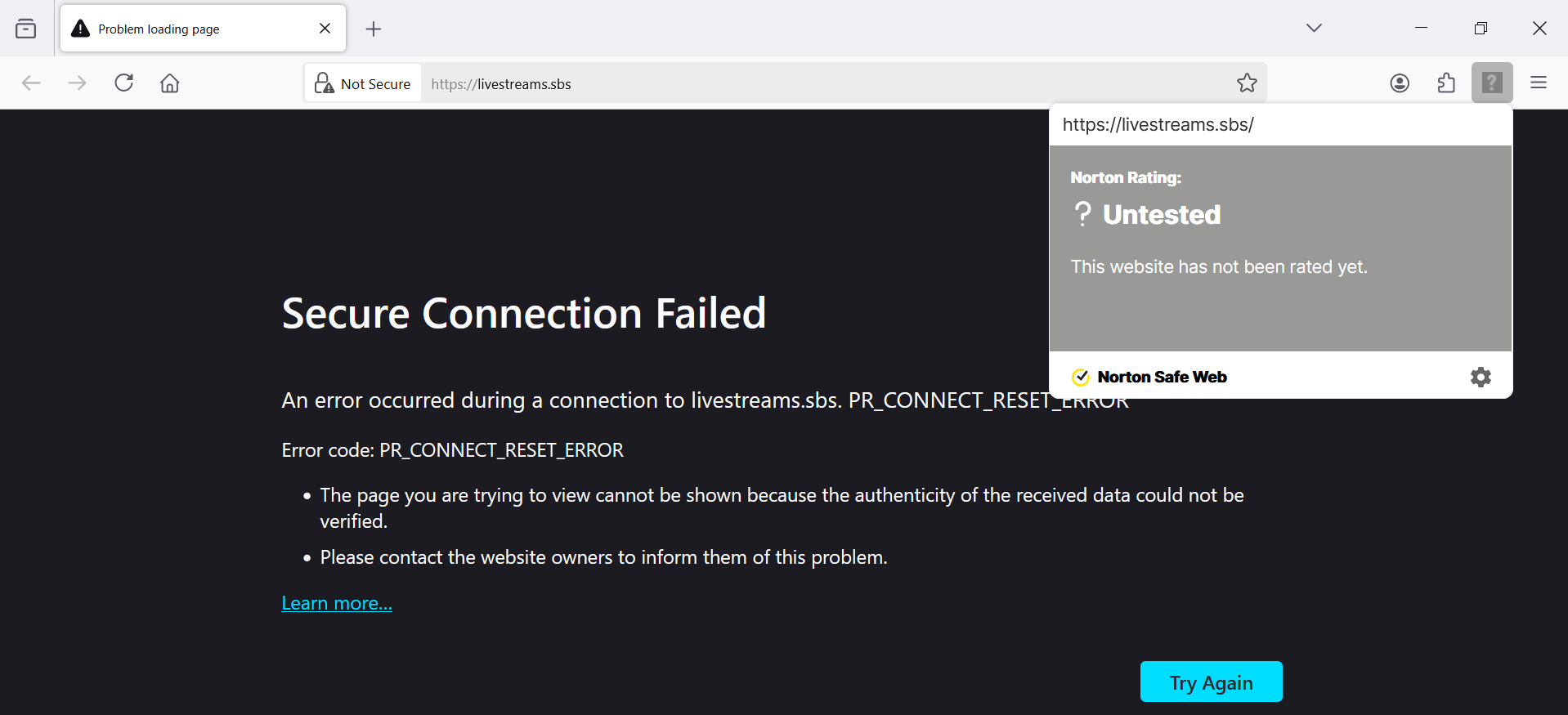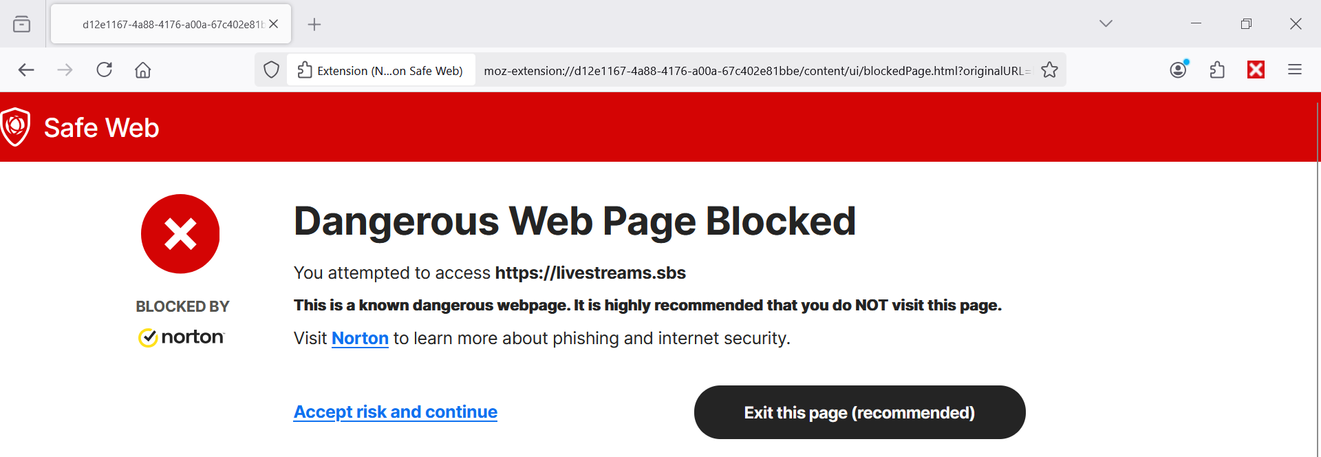fwiw ~ feels like Norton 360 Safe Web block/notice holds power (after closing notice) for a time period and calling suspicious link renders Secure Connection Failed page…then after a time period…Norton 360 Safe Web renders Threat secured notice.