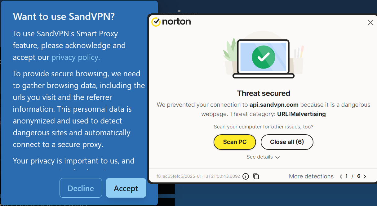 Are you still wanting to run SandVPN extension?..if you do not agree with Norton