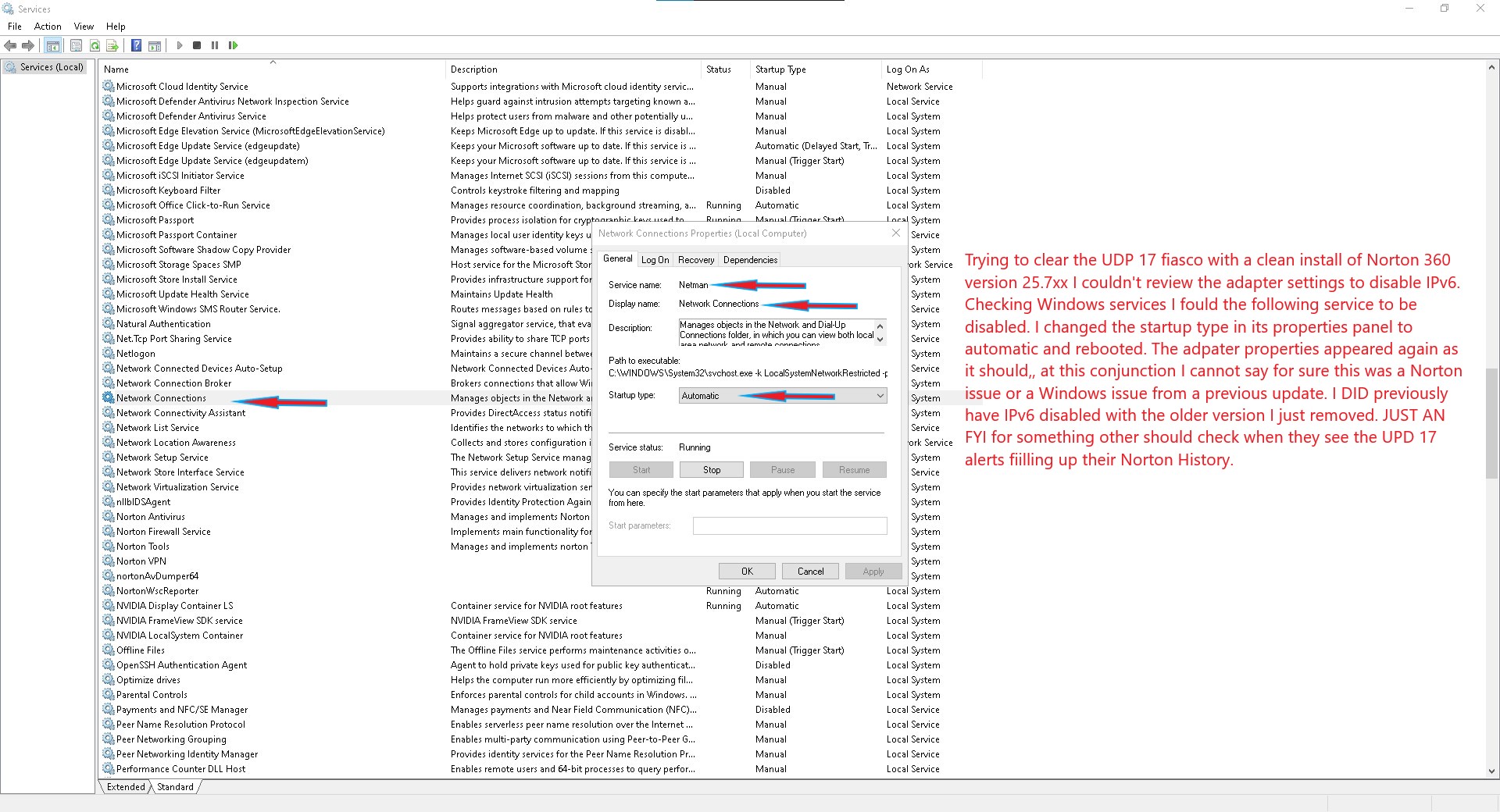 FWIW!! Need a memory jog here, I just did an removal of the older version 22.24.8.36 N360 and did a clean install of the latest version 25.7xx . The UDP 17 crap is once again filling my history. Disabling IPv6 on my network adapter and a reboot didnāt change things. Having been away from the latest version for a long time I need a memory jog for what others have done to fix this mess since we did it way back. Reading this entire thread, of 318 posts is tedious at best. TIA!!