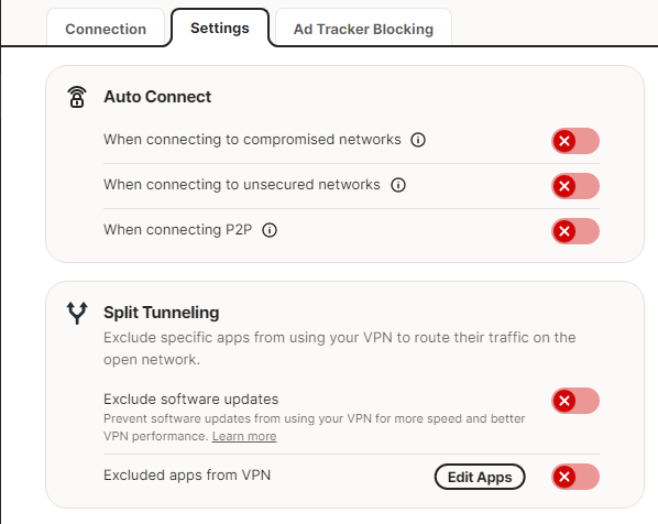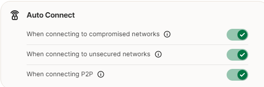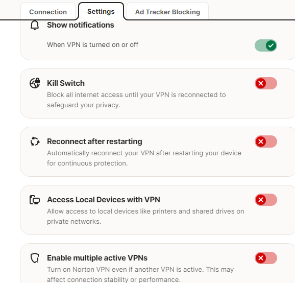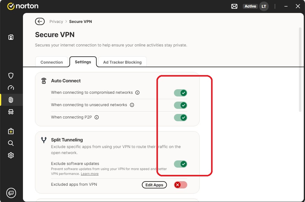 I have my settings as shown on the picture, but everytime I turn off my PC, and turn on back it again, I have to move the slider to enable VPN. Normally I forget to check it, so most of the time I have the VPN off! I have had so many issues with Norton lately, really a lot of problems, like crashing, does not work frequently, and I had my PC attacked by trojans and virus, so many times, I do not trust Norton anymore and as soon my subscription finishes, I will move to another Anti-virus provider. I had to format the entire hard-disk, and re-install Windows, twice on my PC, due to the lack of efficiency with Norton. Ridiculous!