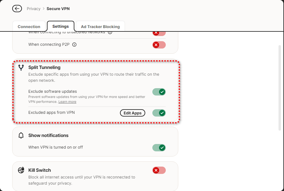Norton VPN offers a Split Tunnel feature that lets you choose which applications use the VPN and which bypass it. In the VPN settings, enable Split Tunnel and add your printer’s executable file (like HP Smart.exe) or the printer’s IP address to the exclusion list.