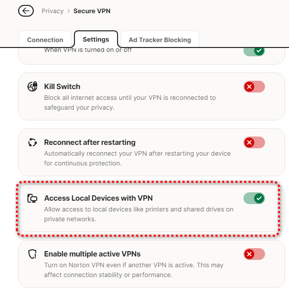 Within the Norton 360 application’s VPN settings under the Privacy section, there is an option called “Access Local Devices with VPN”. Enabling this setting allows your computer to communicate with local devices, including your printer, while the VPN remains active.