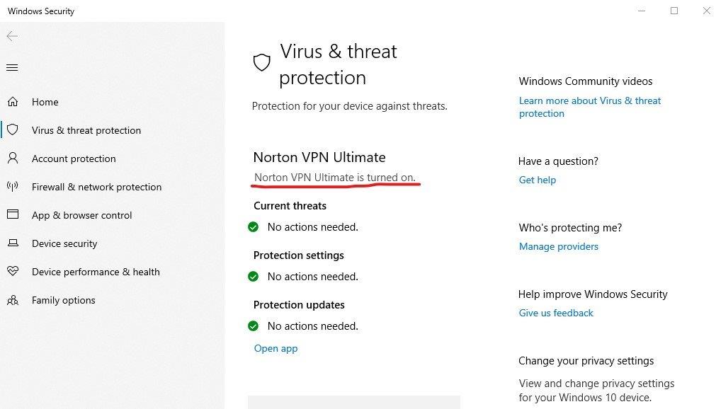 So, on your machine with Norton VPN Ultimate → Windows Security/Defender is running real-time protections?