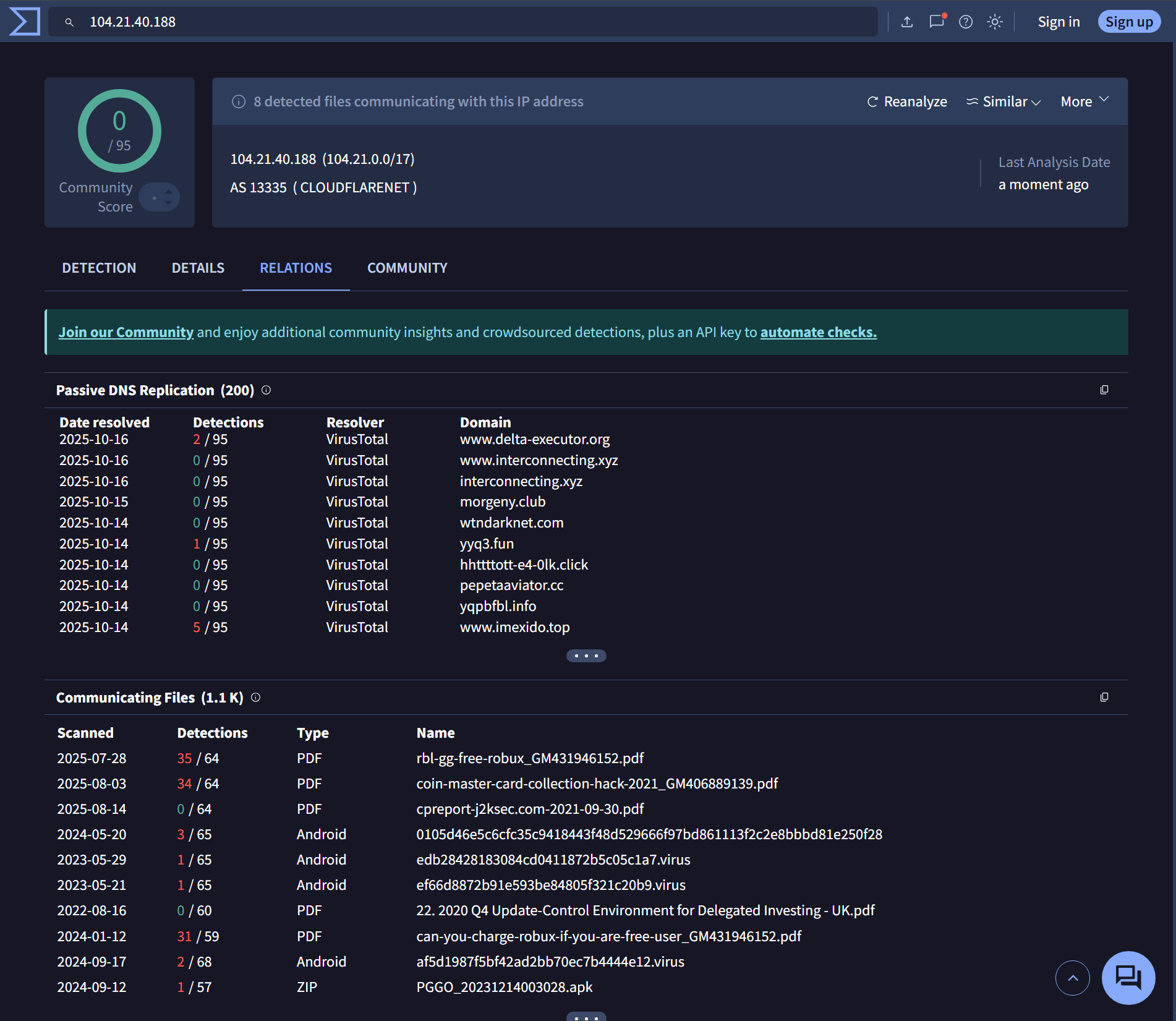 https://www.virustotal.com/gui/ip-address/104.21.40.188/relations